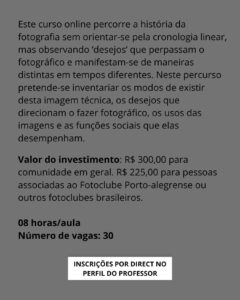 Sobre o cursoAbrindo a agenda de formações do Fotoclube Porto-alegrense em 2025, o curso Fotografia, uma história de desejos propõe um olhar original sobre a trajetória da fotografia. Com a condução de Fernando Schmitt, a narrativa não segue uma linha cronológica tradicional, mas se organiza em torno dos desejos que atravessam o fazer fotográfico ao longo da história.
