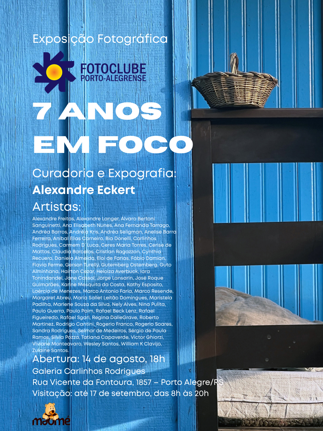 Para marcar essa caminhada, a exposição “Fotoclube Porto-alegrense: 7 Anos em Foco” abre no dia 14 de agosto, às 18h, na Galeria Carlinhos Rodrigues, um espaço de arte e afeto dentro da tradicional Confeitaria Maomé, em Porto Alegre. Com curadoria e expografia de Alexandre Eckert, em parceria com Carlinhos Rodrigues, a mostra convida o público a vivenciar um momento coletivo de memória, expressão e pertencimento.