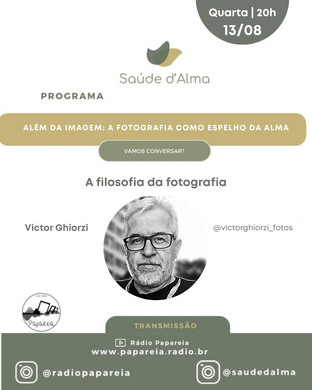Em comemoração ao mês da fotografia, o Programa Saúde d’Alma realiza uma série de encontros sob o tema “Além da imagem: A fotografia como espelho da alma” — e temos a alegria de anunciar que o fotoclubista Victor Ghiorzi estará entre os convidados especiais, no episódio do dia 13 de agosto.