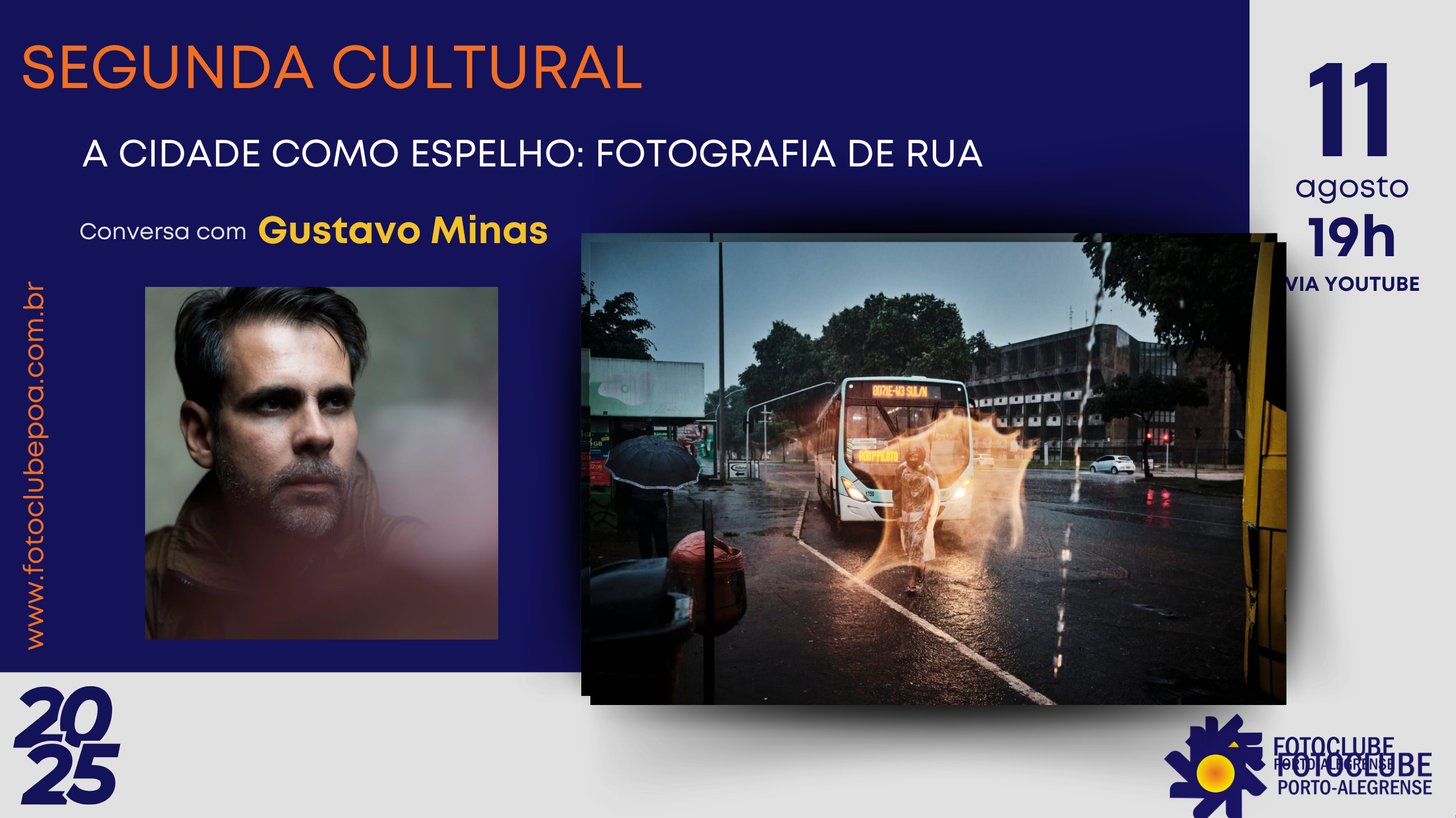No dia 11 de agosto, às 19h, o Fotoclube Porto-alegrense convida você para mais uma edição da Segunda Cultural, com transmissão ao vivo pelo canal do YouTube do FCPOA.