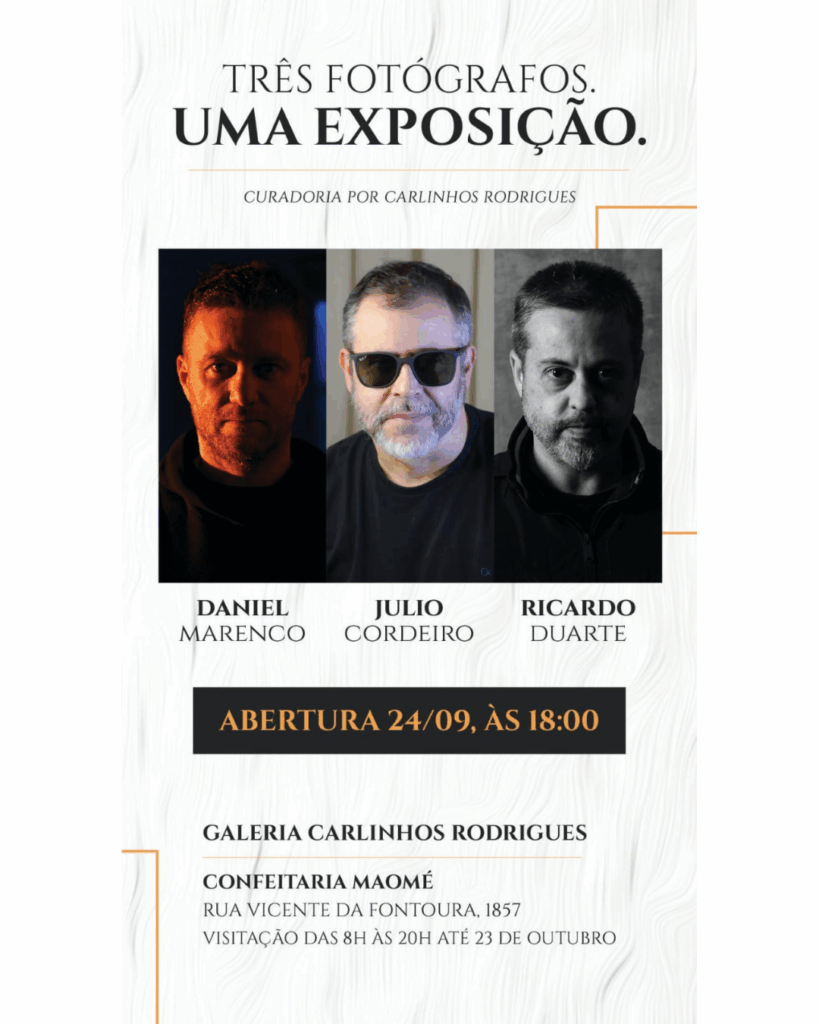 “Três Fotógrafos – Uma Exposição”: Gigantes do Fotojornalismo em Cartaz A Galeria Carlinhos Rodrigues, um espaço essencial de fotografia autoral e afeto no coração da Confeitaria Maomé, recebe uma mostra de grande destaque: “Três Fotógrafos – Uma Exposição”.A mostra reúne o trabalho de três dos mais importantes e premiados fotojornalistas gaúchos e brasileiros: Daniel Marenco, …